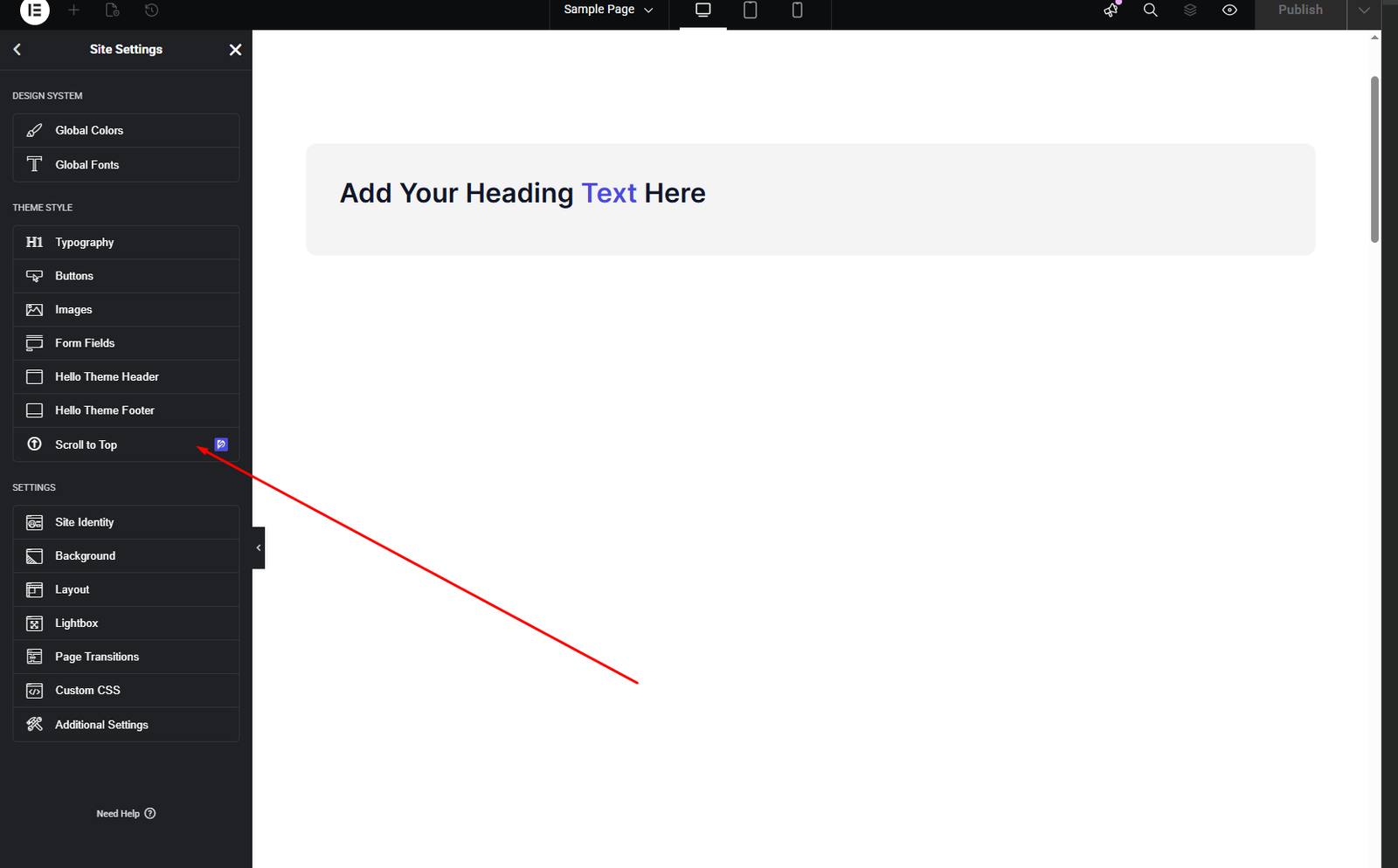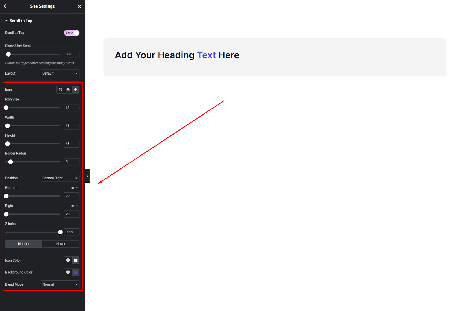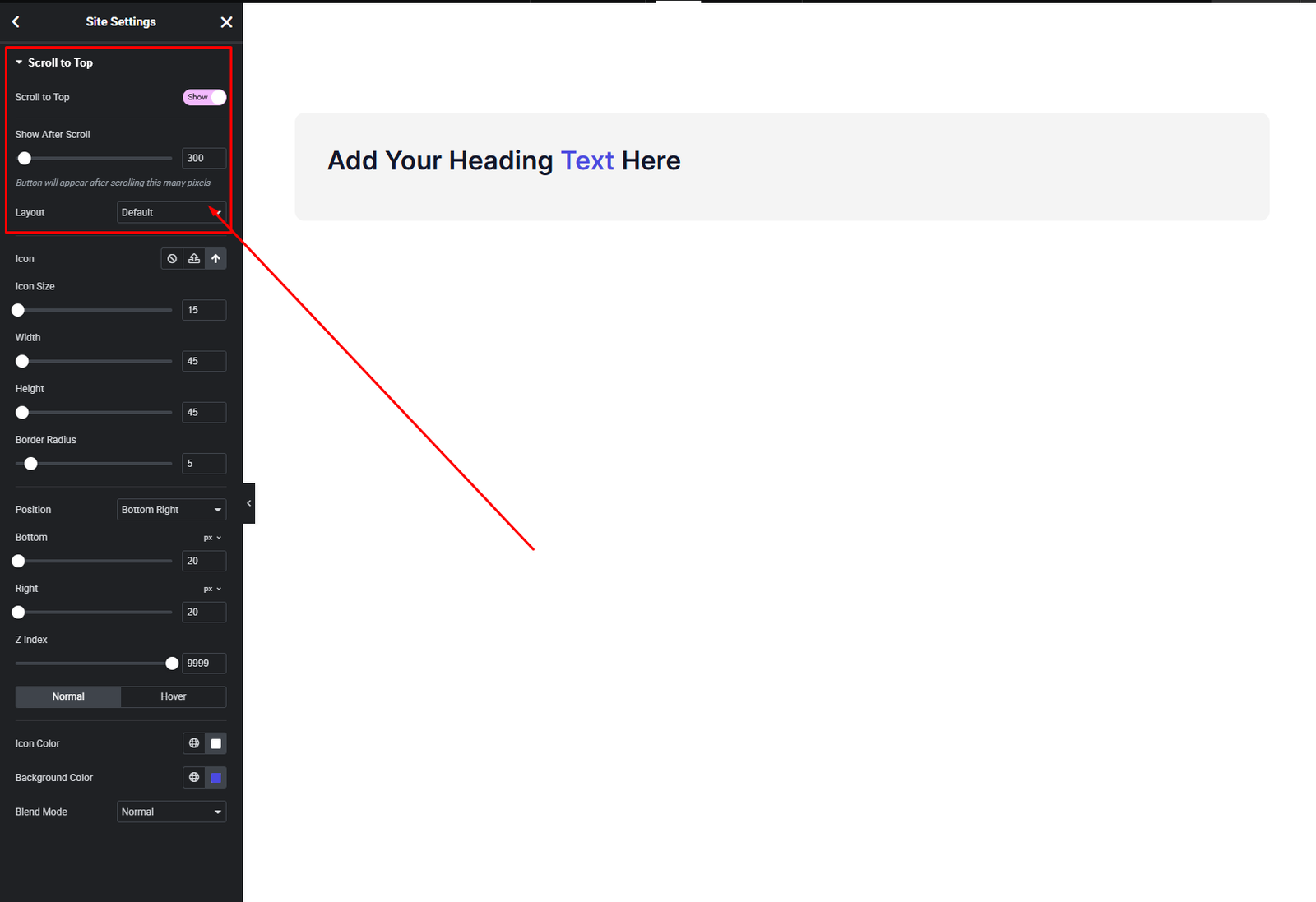 The Scroll to Top settings are available globally from Site Settings.