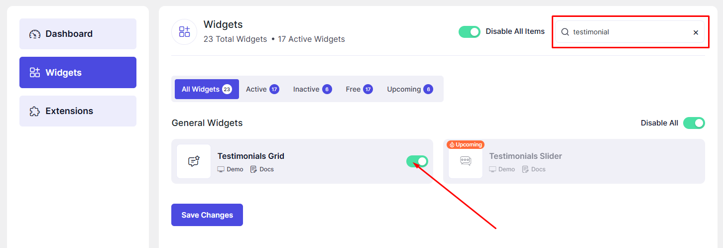 Before using the Testimonials Grid widget, make sure it is enabled from the DesignSute Dashboard.